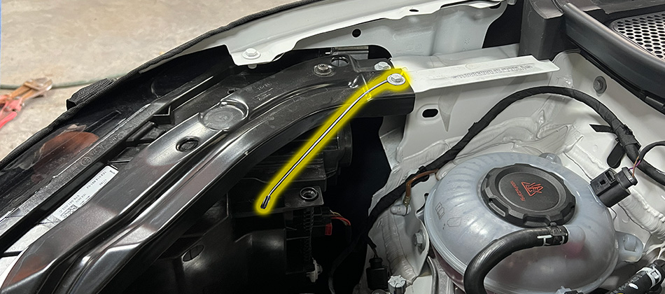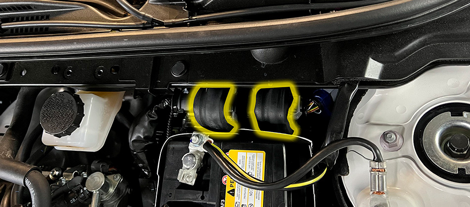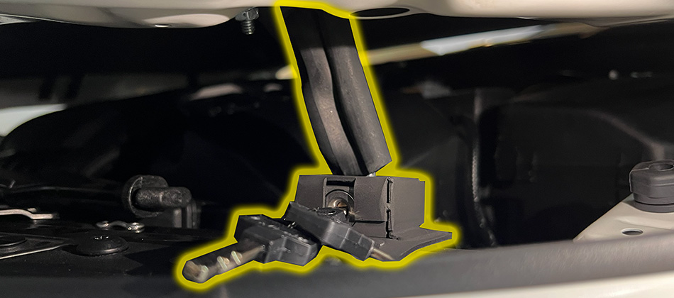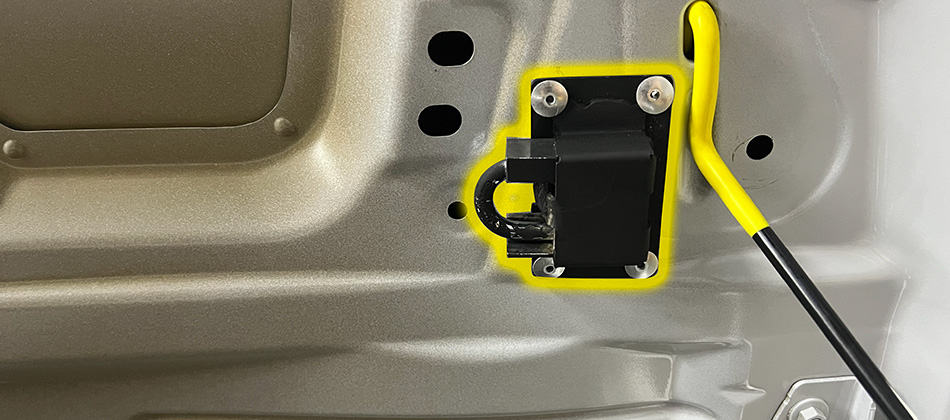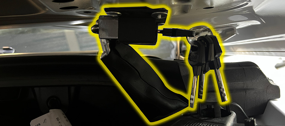 Primero aseguramos el chicote, para que no puedan activar el mecanismo de apertura del cofre. En dado caso que abrieran el vehículo, por ejemplo, de un cristalazo y abrieran el cofre desde el interior, se instala una cadena para que el cofre sólo abra unos pocos centímetros, esta cadena se ancla al cofre y se cierra con un candado que se ancla al chasís.